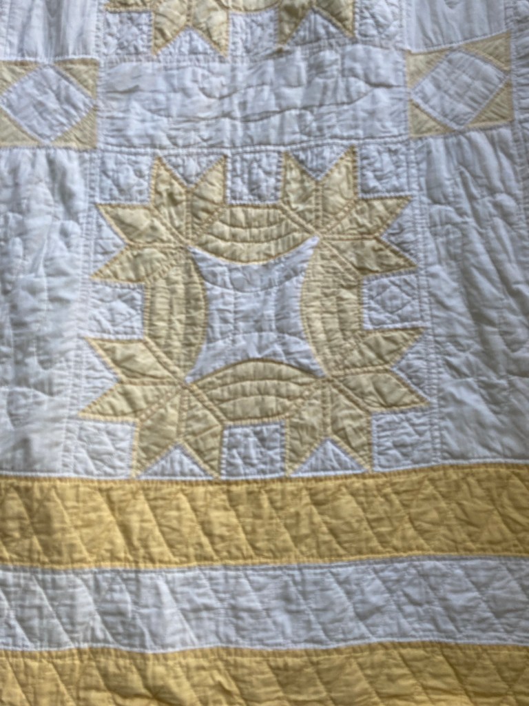 I have a love of vintage quilts. I want to know their stories–Why did the quilter choose to make that quilt? Did she (probably a she) fall in love with a particular pattern? Was it a solo endeavor or a “quilt bee” quilt? Was the fabric purchased especially for that quilt? Or was the fabric leftovers from garments and household items? Was it made for a special occasion–wedding or was it utilitarian-to help keep the family warm. Was it her first quilt or was it one of many? Sometimes I am lucky and learn a bit of the history.