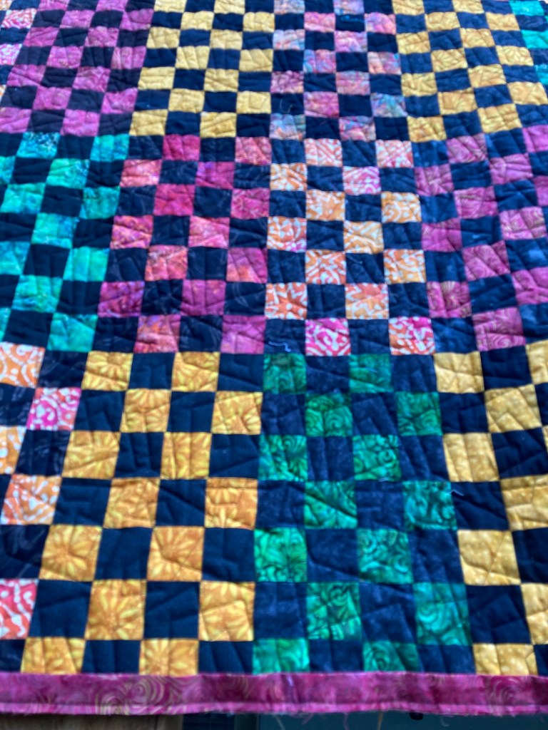 Another MaggiePearl quilt–this time out of batiks and various black fabrics. We had challenged ourselves to at least one quilt in the sale that was from the stash of fabrics in the quilt room. This is mine. These batiks are from the family of one of the original Quilters at First quilters. In these photos the binding is sewn on but needs to be folded over and hand sewn. It is 64″ x 72″ and you really must see it is person–the colors are so much vibrant than what I captured.