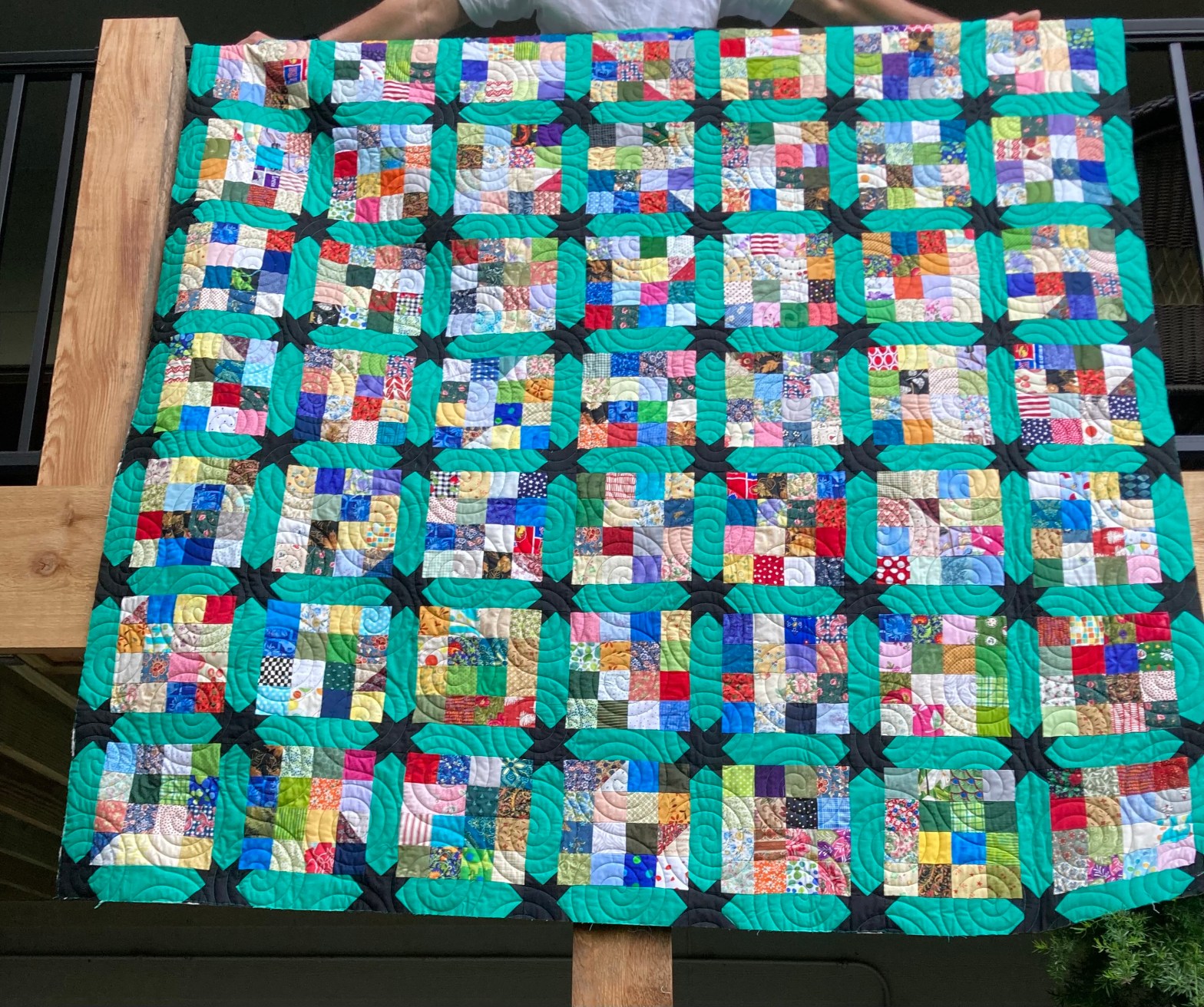 Those are my husbands hands doing quilt hanging duty on our deck-