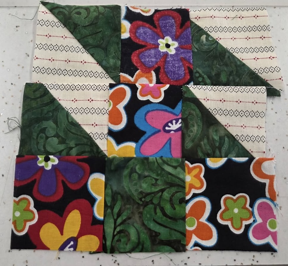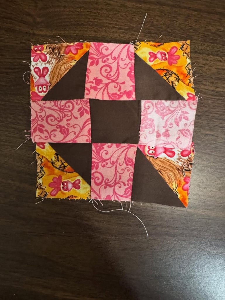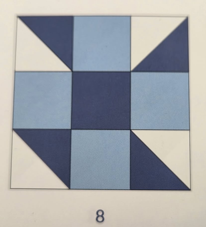 Kane and Rev. Jeff were advised to select something simple as they perused block pattern books, but who wants simple? They chose this one. Going to tackle “half square triangles” along with everything else? Why not? But this pattern did illustrate one “rule of quilting”–use a dark, a medium and a light fabric for contrast. Next step was to select their fabric from our mini store. I did refrain from saying “Really?”