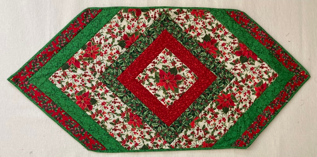 Christmas is never far behind Halloween. A holiday table runner quickly changes the mood of a room. Traditional red and green prints were used in this 22″ x 46″ runner. It is machine quilted and hand bound. There is a touch of shiny gold adding to the festive look. $50
