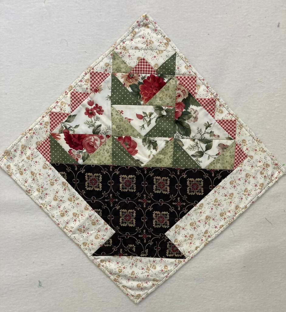 This block was donated to us and Vicki finished it as a table topper or small wall hanging. The gingham prairie points that form the basket’s handle are 3-D. The fabric prints are from the same line, coordinating beautifully. It is machine quilted and hand bound. 19.5″ x 19.5″ $40