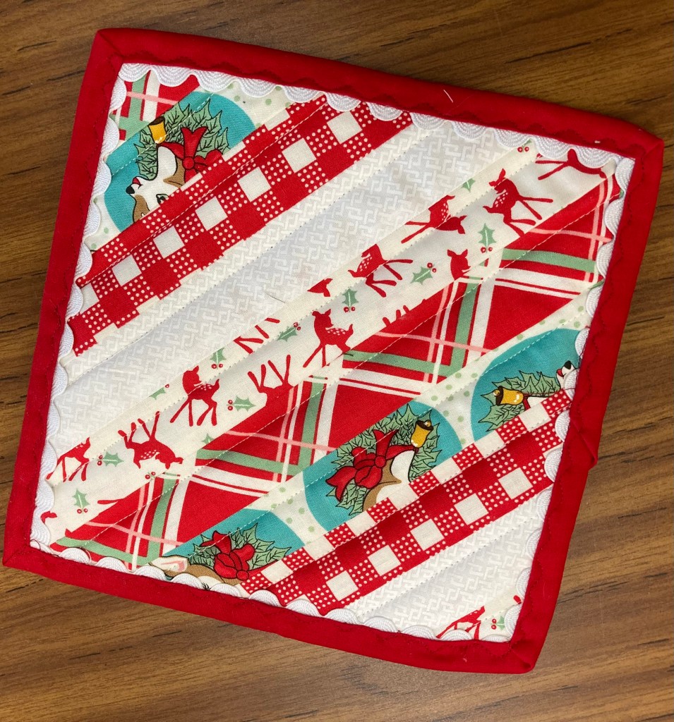 One of many pot holders or hot pads. This one has Insul-Bright as one of the layers of batting. Insul-Bright is a polyester batting with mylar woven into the batting, which reflects heat. $10. A good hostess gift or an addition to a gift basket.
