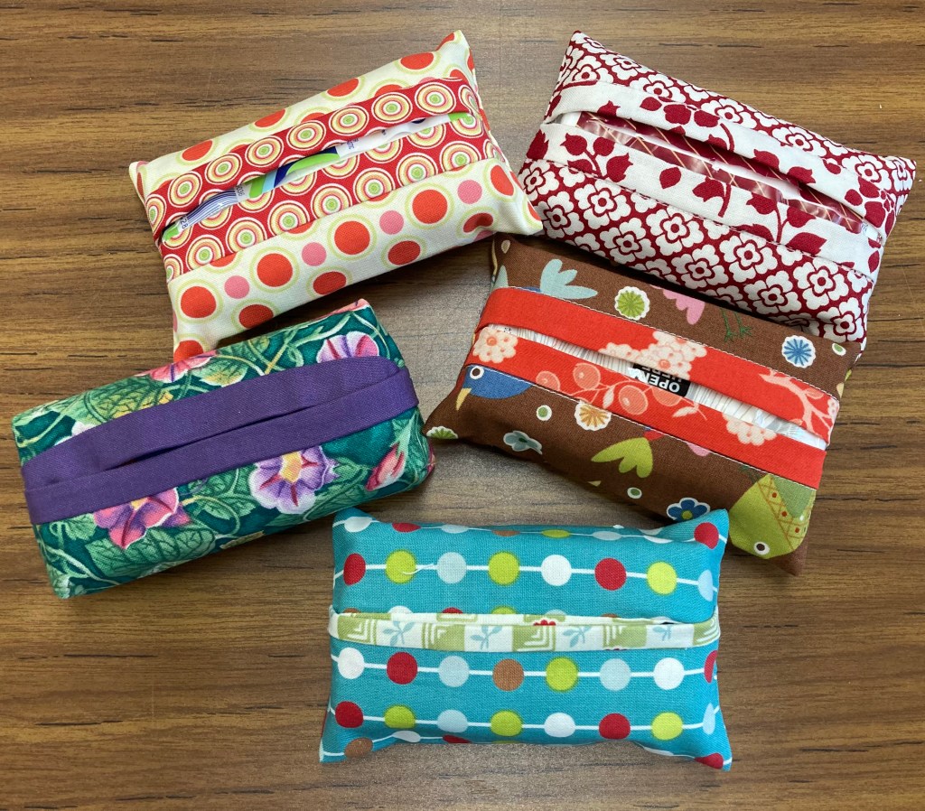 These fabric holders keep your tissues from becoming nasty and unusable in your bag. $5 each–a couple of dozen different fabric choices.