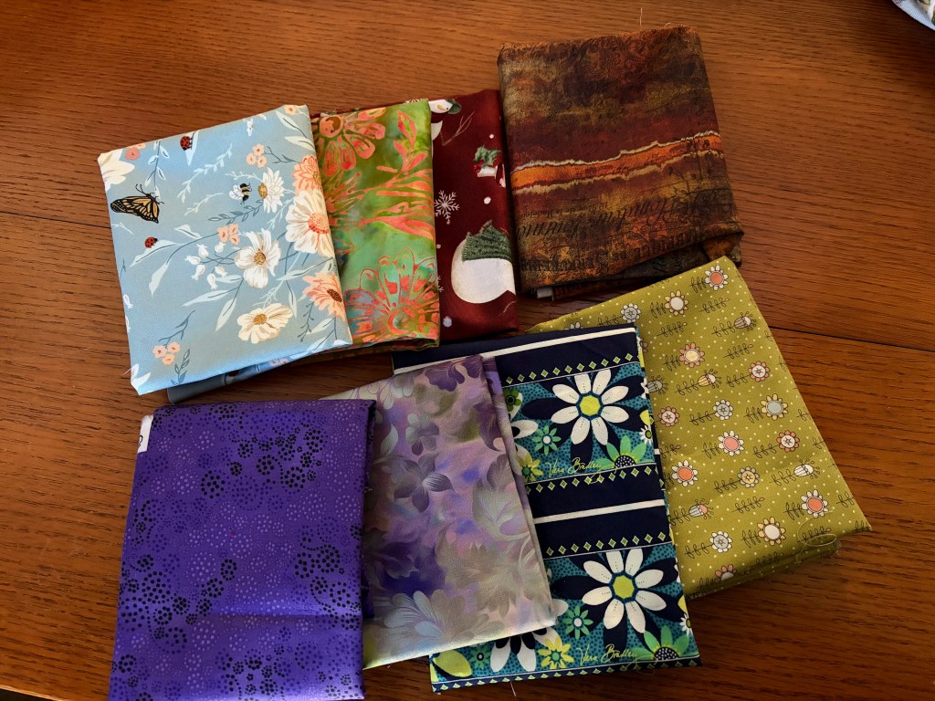 This is Janis’ fabrics!! And you may very well ask..What was her theme or request? Hmmm, nothing really goes together, does it? She surprised us with ” I really like this fabric” request. She wanted a FQ of something you liked but had no idea what to do with it. I would like to say each FQ reflected the quilters style, but no. I would never be able to match the quilter with the fabric. I choose the light blue with the butterfly–sorta my vibe.