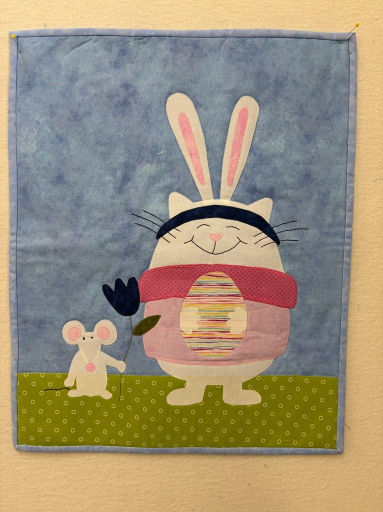 This appliquéd kitty masquerading as an Easter Bunny would be a fun addition to your spring decorations. The wall hanging is 16″ x 20″, easy fit in most homes. $40