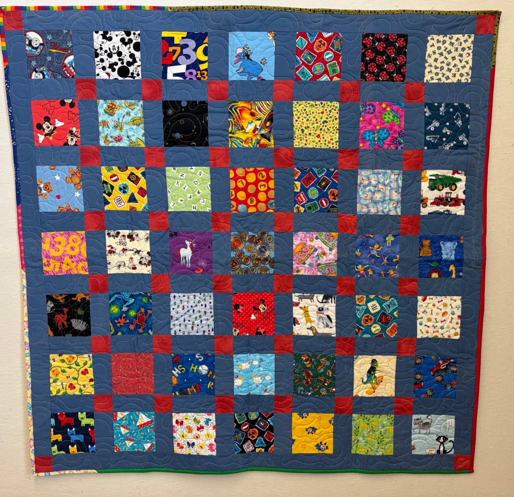 I Spy a Unicorn and a puppy and a teddy bear. This child’s quilt is a learning tool as well as a fun nap quilt. “I Spy” quilts keep children occupied on long car trips and when they need quiet time on their own. The quilt, 46″ x 48″, is the perfect size for tummy time. The quilt is machine quilted, with a machine sewn binding making it very washable. $75