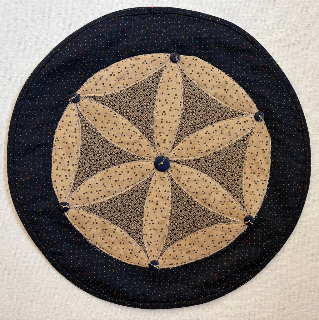 The fabrics in this table topper are from the Kansas Trouble line. It is a 17″ diameter. The design is machine appliquéd with hand sewn buttons. Perfect for a small end table. $30.