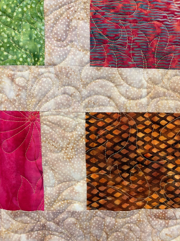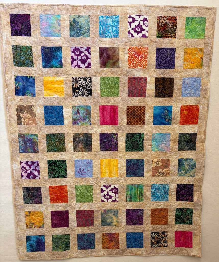 Batiks are a special group in the fabric world. This 46″ x 60″ lap quilt is all batiks–even the backing. The neutral batiks used in the sashing allowed all the vibrant colors to shine. The binding is hand sewn. $150.