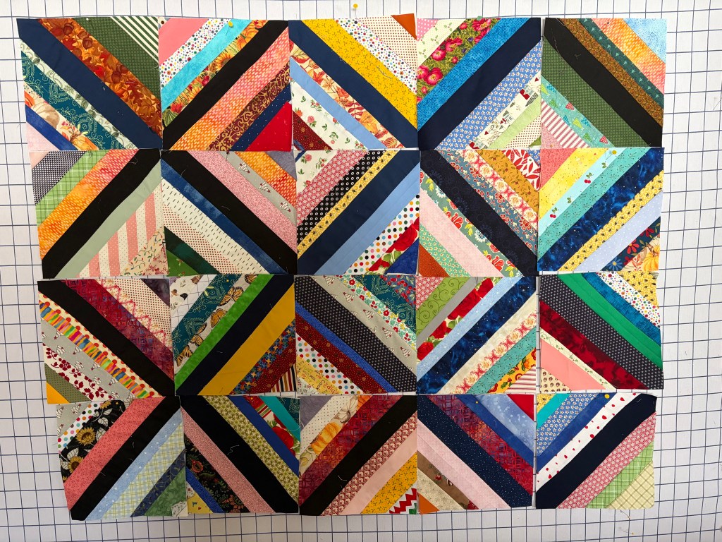 The block is trimmed to a 10″ square–I try to put the 90 degree angle (corner of square) in the middle of the focus strip. Trim from the muslin side, much easier.