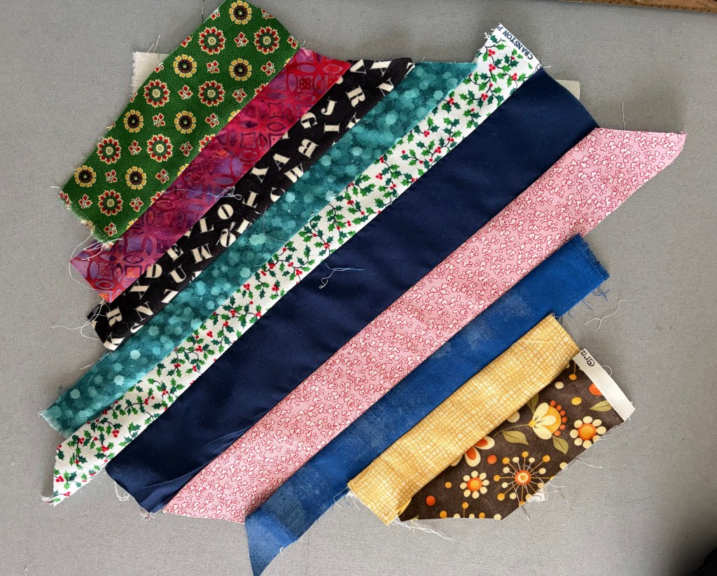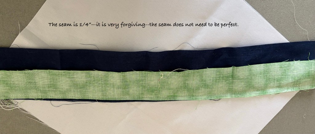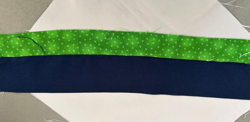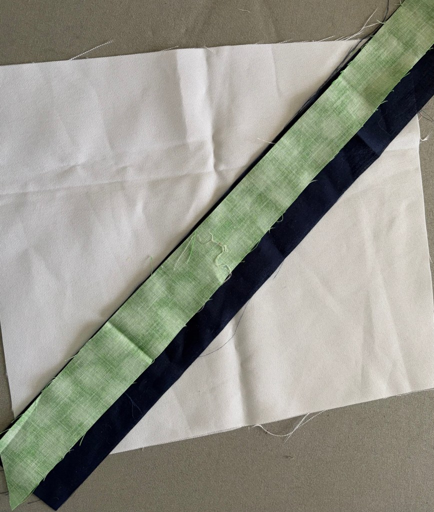 The first strip is either a 2″ to 2.5″ strip of dark blue solid or print or black. It is placed diagonally, extending from corner to corner. A second strip is place wrong side up on one edge of the center strip.