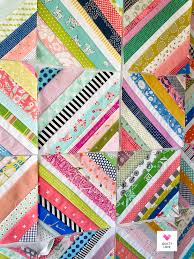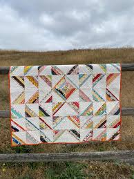 These are examples of string quilts (the photos are from on line). String quilts are scrap friendly and utilize leftover fabric strips an inch to 2.5″ wide. The strings are sewn on a foundation, either paper or muslin. The blocks are trimmed to a specific size and sewn together. The blocks often have a focal point, either the middle string is the same or in the same value or the corners are sewn with a similar fabric. This gives the quilt more of a pattern. The blocks can be “on point” (the photo on the right) or in straight rows (the photo on the left and in the middle).