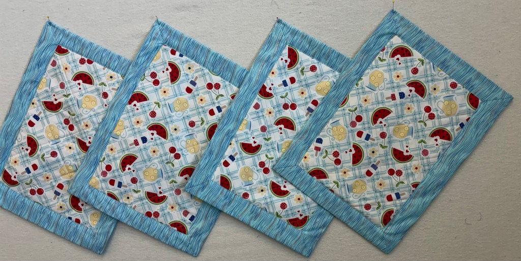 The summer picnic placemats are backed with the blue fabric that creates the binding. There are 12″ x 16″ and can be yours for $40.