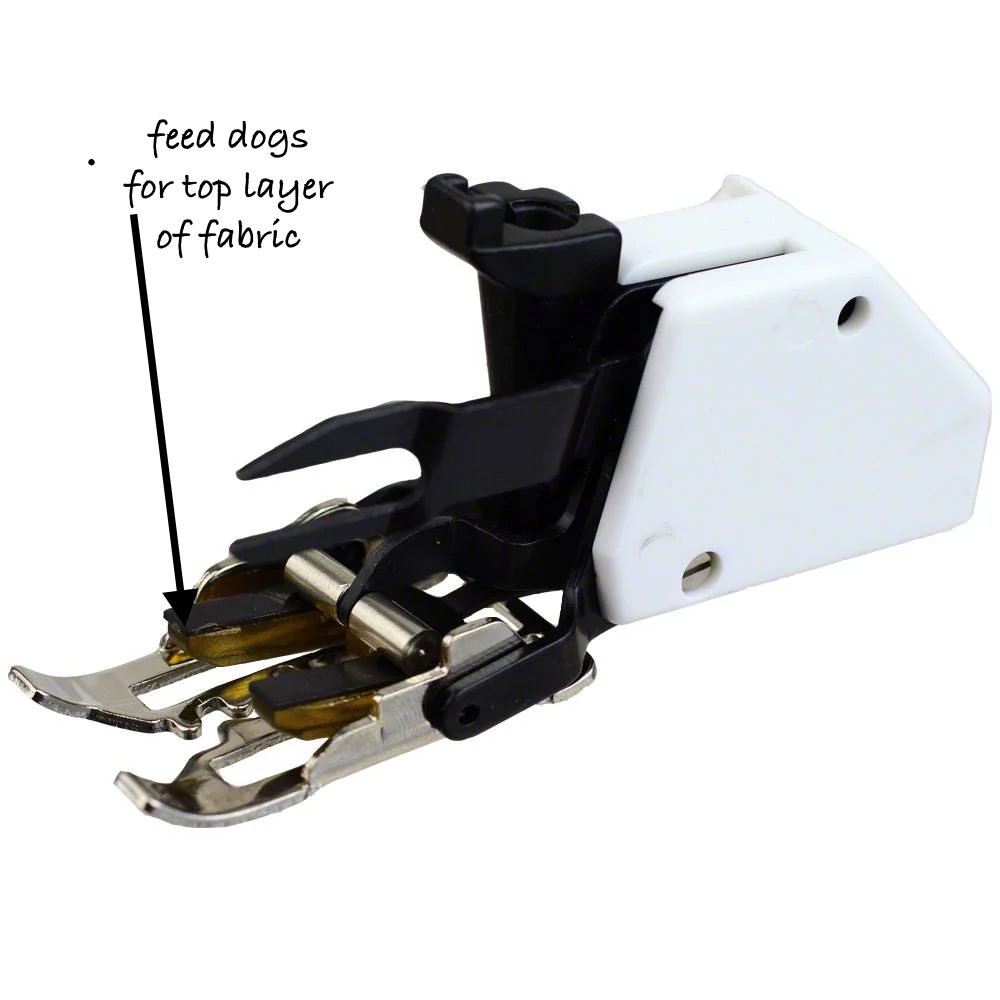 The walking foot has an extra set of feed dogs on top creating equal pressure on the top and bottom. Therefore the walking foot eliminates puckering and fabrics sliding apart.
