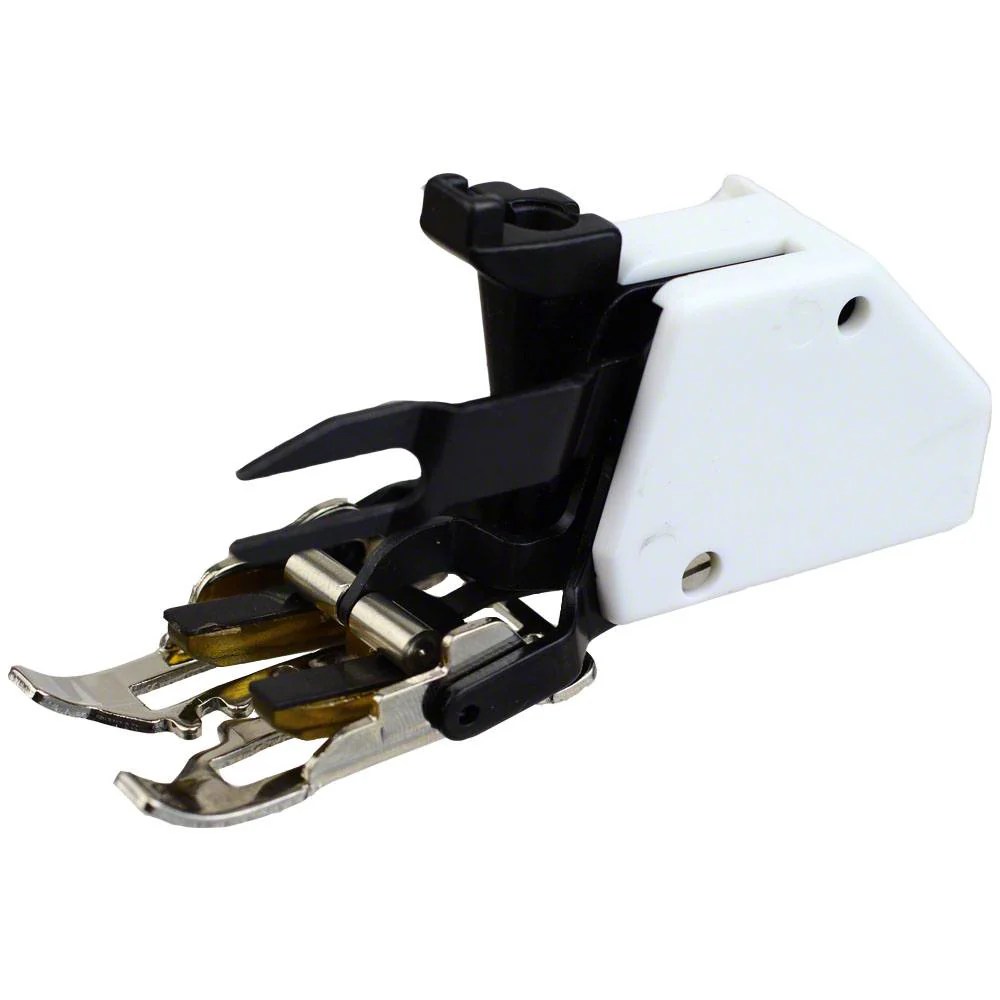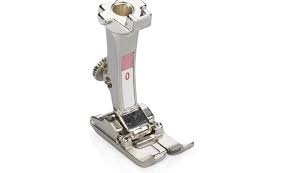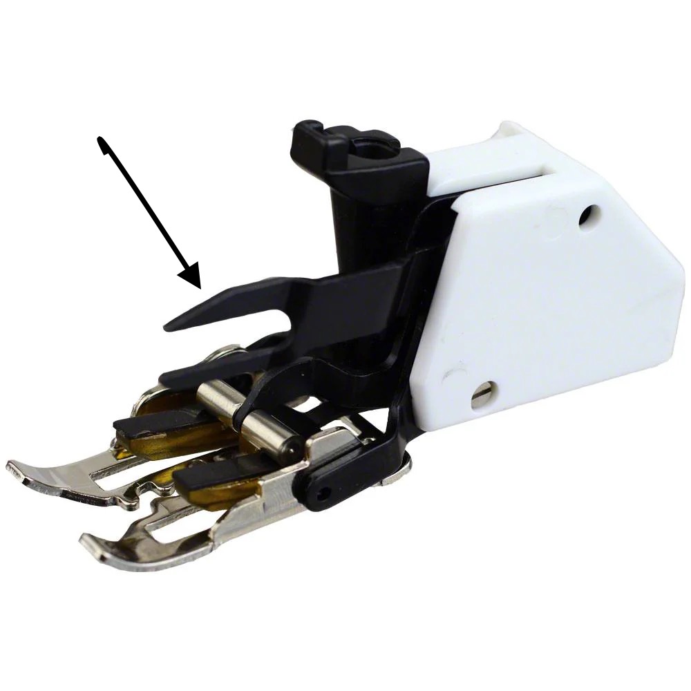 This is a regular presser foot. It is lowered after the fabric is inserted between the foot and the feed dogs to insure even stitching.
