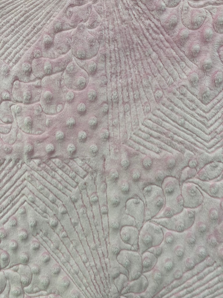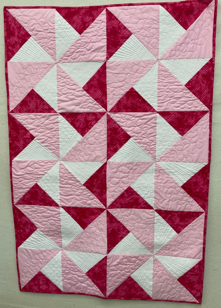 The quilt measures 35″ x 66″. The backing is a soft pink Minky. The custom machine quilting makes these pinwheels stand out. $100