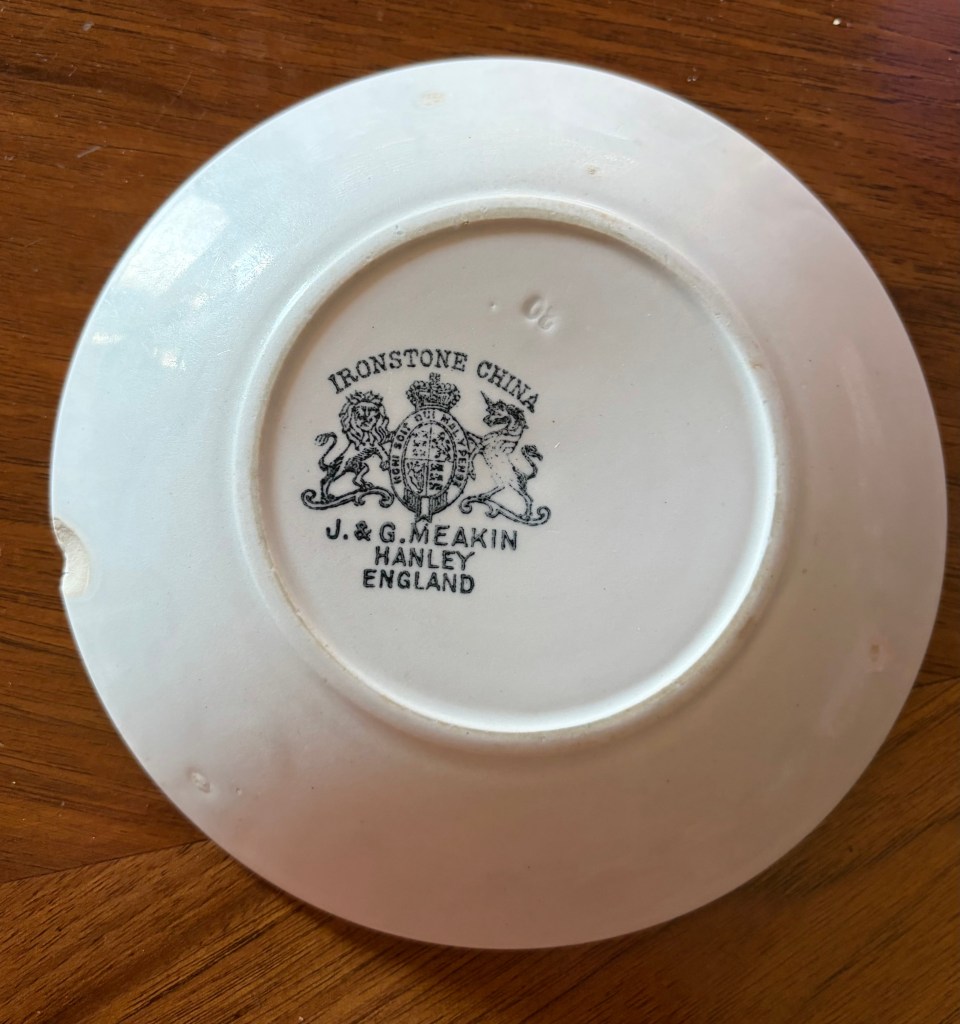 I have no clue when or how he came to own this common ironstone china. I have looked up J & G Meakin and discovered they were one of the largest pottery companies in England. They were located in Hanley, Stoke-on-Trent—the hub of the wider potteries area. This piece can be dated between 1891 and 1912 due to the addition of England to the stamp on the back.