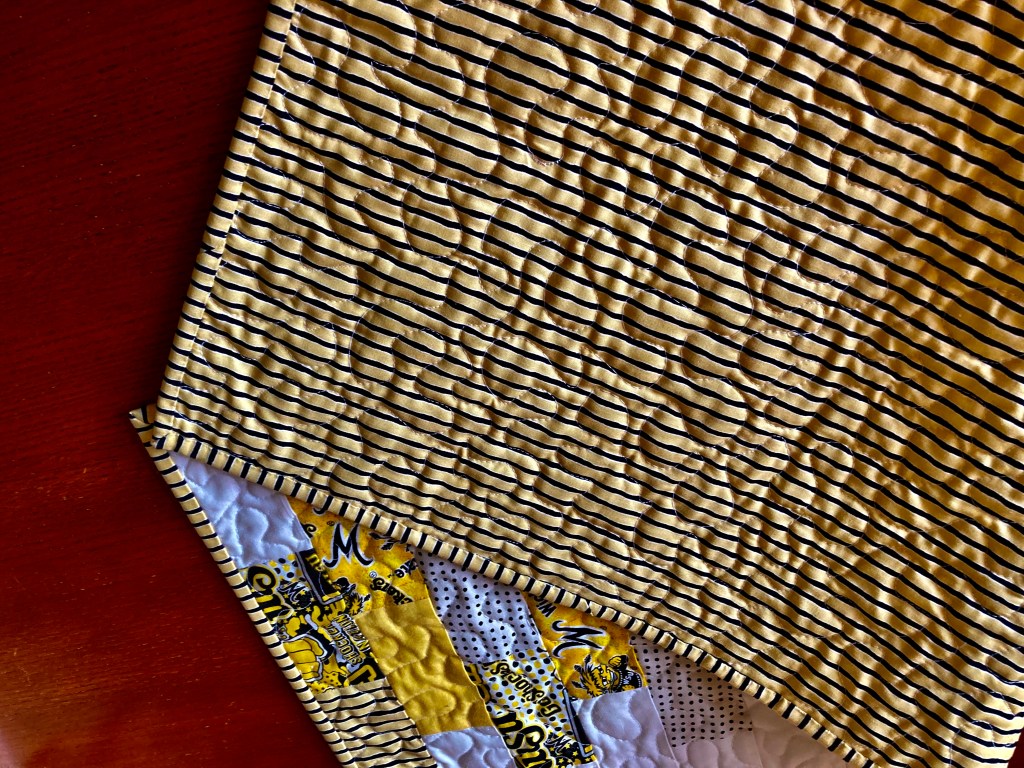 Although it appears to be pieced, it is a whole cloth with gingham butterflies and pastel flowers. The back is a coordinating fabric and it is bound in a sparkly stripe. Machine quilted with cotton blend batting. The quilt measures 42″ x 54″ and is $50. This quilt would last through toddler and pre-school ages.
