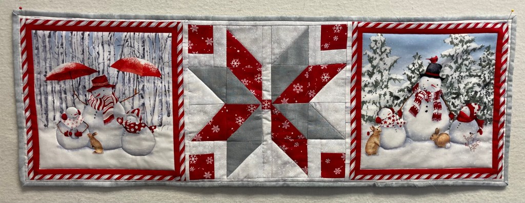 Do you like cats? The border features “psychedelic” cats (psychedelic according to Siri denotes an intense, vivid color or a swirling abstract pattern). The blocks are framed with blue sashing. The backing is a soft blue Minky. Mindy is very lightweight but very warm. This quilt is 49″ x 54″ and is $60.