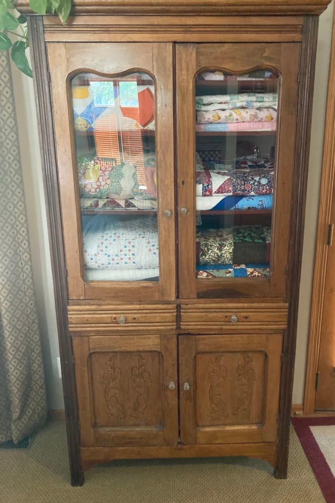 I use quilts to cover up tops of furniture, at the end of the bed during this transitional season and to fill a pie safe of my grandmother—everything needs a function!