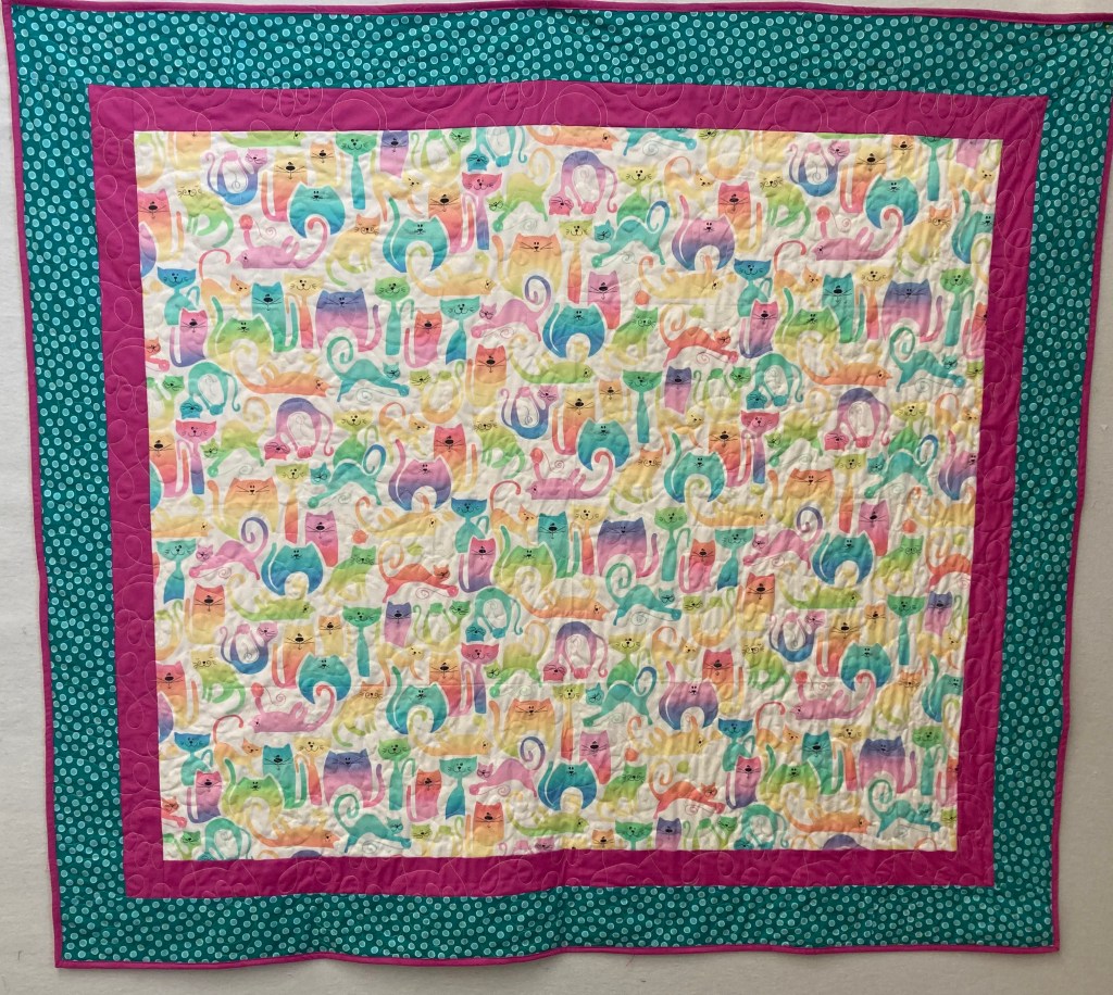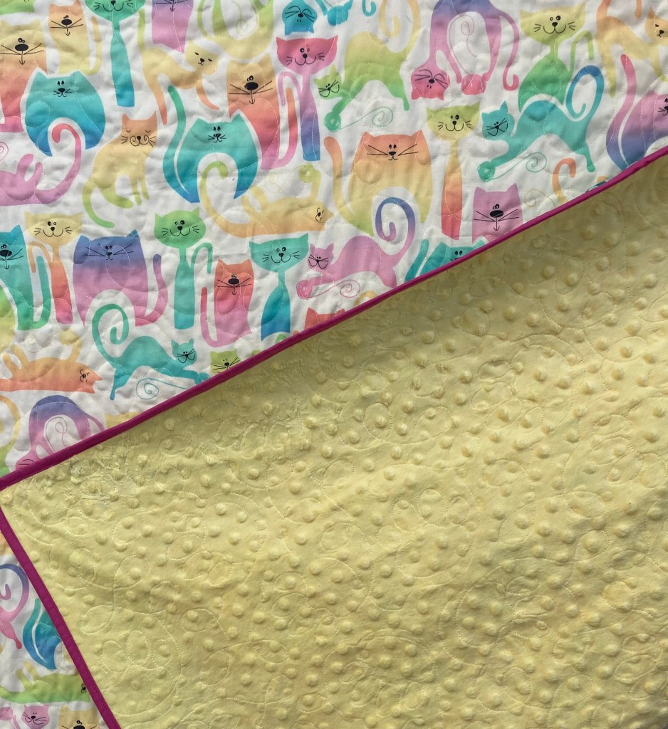Every one of these pastel cats are smiling! This “quilt” is more of a blanket because there was no batting used making it very foldable. The backing is Minky– textured polyester, that is so soft. It measures 48″ x 54″ and is $50.