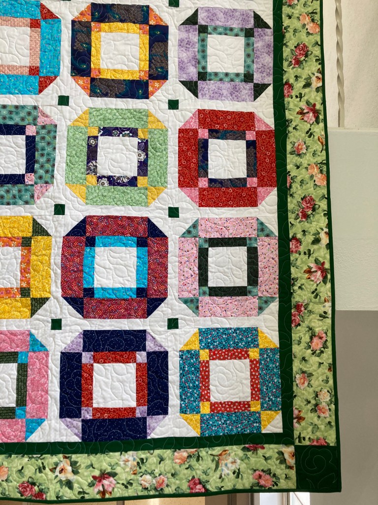 A “block of the month” quilt–a variety of blocks using several quilting techniques was used to complete this queen size quilt.